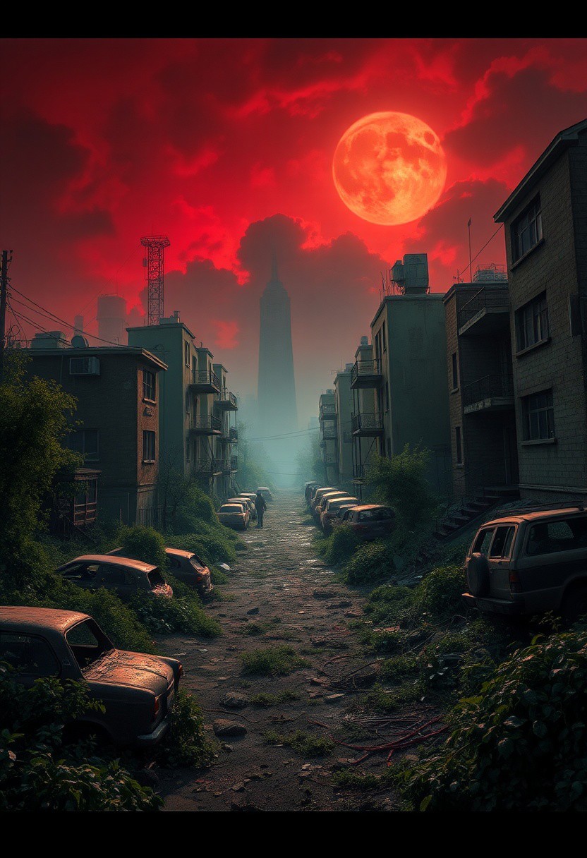 A desolate urban landscape during a zombie apocalypse, overgrown with vegetation, abandoned cars, and crumbling buildings, dramatic lighting with a blood-red sky, high detail, cinematic composition, digital painting, inspired by the works of Simon Stålenhag and Ian Holmer, 8k resolution, hyperrealistic atmosphere, intense survival scene with zombies lurking in the shadows