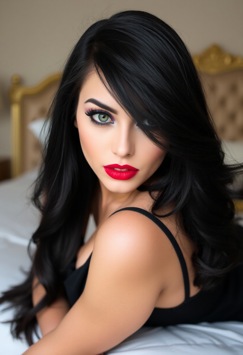 A beautiful woman is looking at viewer seductively and assertive. Her eyes are dark green with long black eyelashes and purple eyeshadow on her eyelids. A black eyeline and mascara are defining her beautiful eyes. Her very long black hair is covering her one eye. Her lips are sensual and painted red. Her makeup is elegant, boosting her best details on her pale skin. She wears a classy long black dress and black high heels. Her body has sexy curves. The background is an elegant bedroom with a classy bed. She is sitting on the bed, leaning slightly toward the viewer sensually.