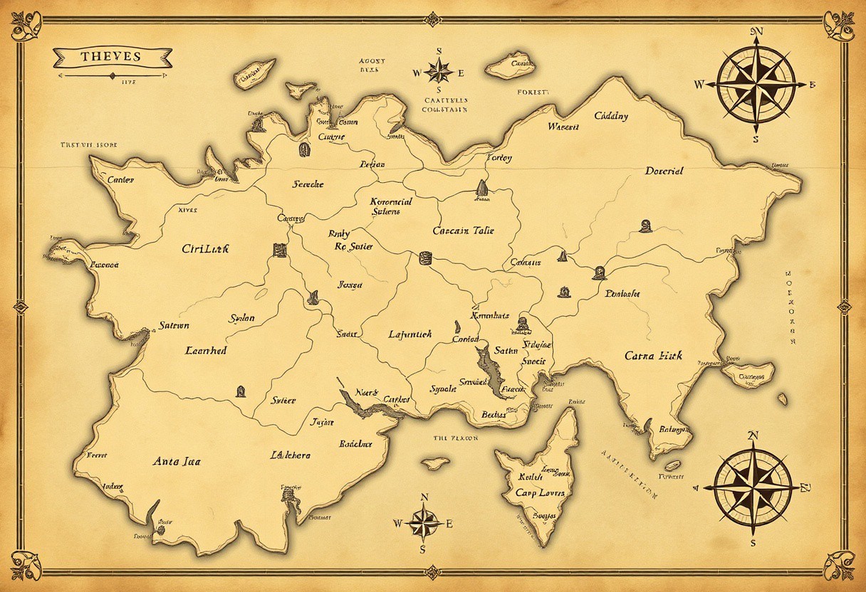 Elegant map of a vast fantasy world with an old, vintage feel. Minimalist design, aged parchment texture, delicate borders. Elegant calligraphy for labels, classic cartography style. Text in runes. Smooth coastlines, rivers, hills, mountains and forests. Small towns, castles, and ports marked with basic icons. Intricate compass rose, subtle grid lines. Muted colors, sepia tones, and faded ink for an ancient, timeworn appearance. Map exudes an air of history and elegance, like an artifact from a forgotten era.