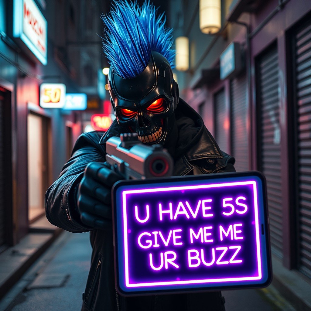 Cyberpunk criminal with glowing blue glass fiber mohawk and black skull mask, glowing red eyes, glowing teeth, black leather coat, in cyberpunk street alley, aiming a futuristic gun at viewer showing futuristic ipad with neon text on it "U HAVE 5S TO GIVE ME UR BUZZ", neon lights, night, wet asphalt