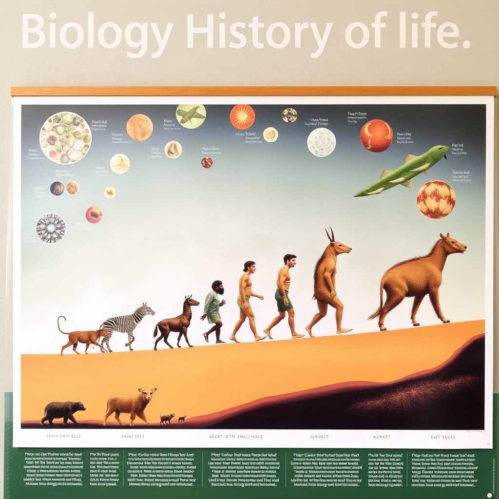biology history classroom poster depicting the evolution of life from the first cells to human beings, animals walking in a circle from the tiniest toward the tallest