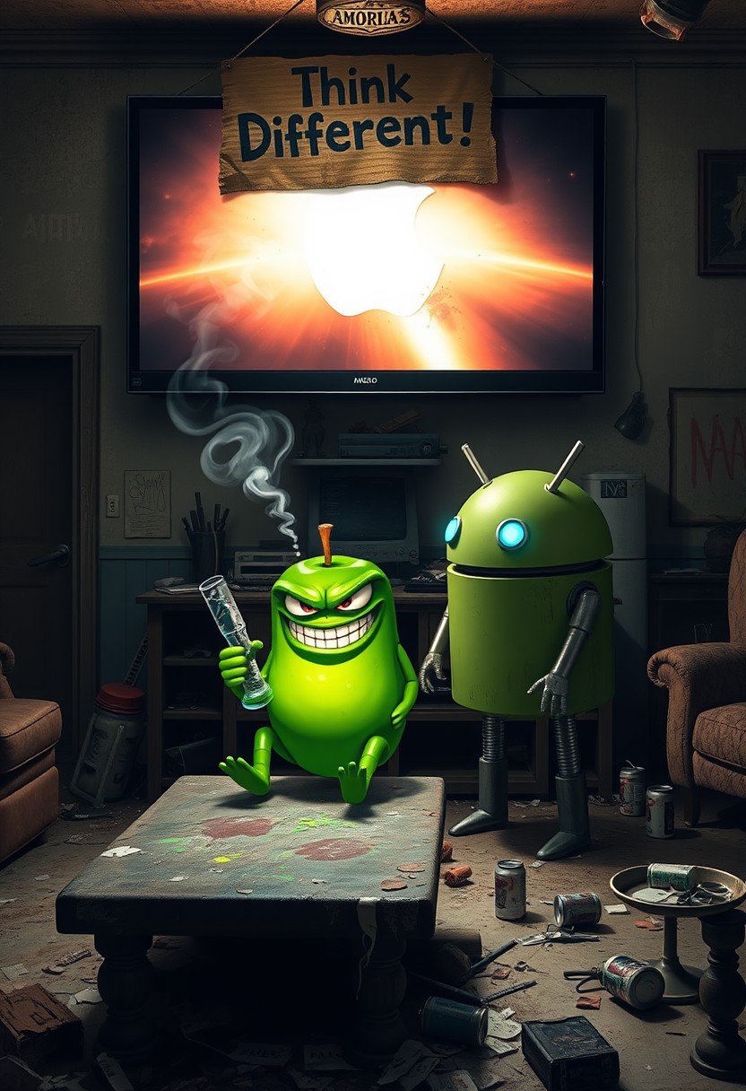 "In a grimy, dilapidated Florida crackhouse, a cartoonish green apple with exaggerated, glaring eyes and twisted limbs engages in a surreal confrontation with the iconic Android logo robot. The apple, seated on a battered, stained coffee table, grins menacingly, clutching a glass pipe. Wisps of smoke curl up from the pipe, drifting through the harsh, flickering light of a massive OLED TV mounted on the wall. The TV blares an unnervingly vivid Apple computer commercial, its bright visuals casting sharp, unsettling shadows across the room. The walls are covered in grime and graffiti, with peeling wallpaper and broken fixtures. The floor is littered with trash, broken furniture, and empty cans, adding to the squalid atmosphere. The Android robot, with a rusted, dented exterior and malfunctioning eyes, stands in a defensive stance with twitching antennae. Above the TV, a warped, grimy cardboard sign with 'Think Different!' hangs crookedly. The sign’s jagged, irregular lettering is illuminated by flickering LEDs, casting eerie shadows on the peeling stucco walls. The air is thick with the stench of mildew and decay, mixed with the acrid smell of smoke from the apple's pipe. The green apple’s glossy skin and the Android’s grimy, rusted body are highlighted by the cold, flickering light, enhancing the bizarre and unsettling scene in this derelict, drug-ridden setting."