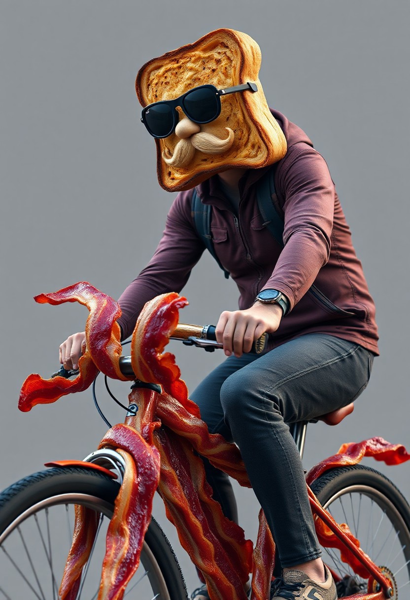 "Create a photorealistic image of a person riding a bike, but with a twist. Their head is actually just a piece of toast, complete with a mustache and dark aviators drawn on with icing. The toast head should be rendered in exquisite detail, with visible crumbs and texture. The bike itself should be made up of crispy bacon strips, intricately woven together to form the frame, wheels, and handlebars. The bacon should be rendered in a way that makes it look crispy and edible, with visible fat and texture. The overall effect should be one of playful, whimsical humor, as if the person is enjoying a fun and carefree ride on their bacon bike." Highest-Quality, 4k, intricate details, visually stunning, Masterpiece