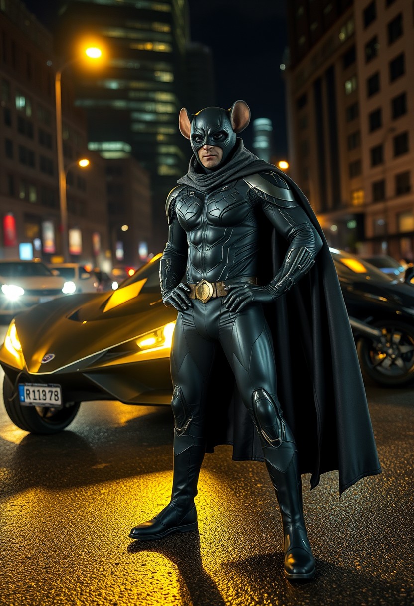 Superhero Ratman, a man wearing a dark gray rubber bulletproof futuristic and cape bodysuit posing next to his awesome futuristic Ratmobile, upper face covered with rat resembling rubber mask, Ratham city in the night, wet asphalt, dramatic light