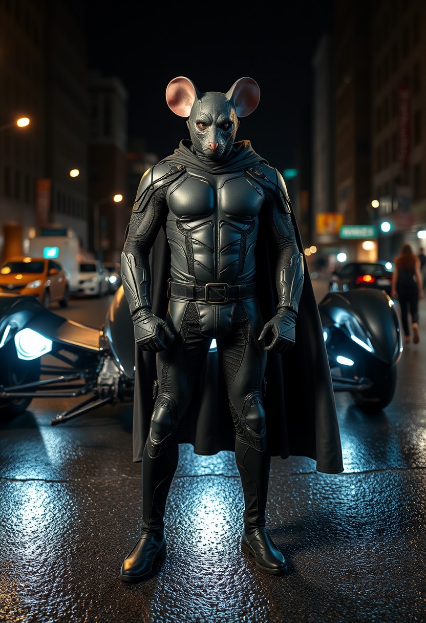 Superhero Ratman, a man wearing a dark gray rubber bulletproof futuristic and cape bodysuit posing next to his awesome futuristic Ratmobile, upper face covered with rat resembling rubber mask, Ratham city in the night, wet asphalt, dramatic light