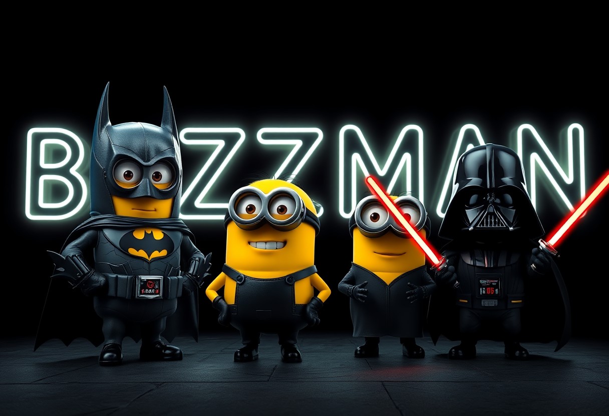 A minion from Despicable Me transformed into a Batman-inspired character, dressed in a full Bat-suit with a sleek cape and cowl, striking a heroic pose and exuding a powerful presence. Next to this Batman minion stands a minion styled as Catwoman, complete with her sleek black catsuit, mask, and iconic goggles, adding a touch of feline elegance. Completing the ensemble is a minionized Darth Vader, with a miniature version of the iconic helmet and armor, wielding a tiny lightsaber with a menacing yet adorable stance. Dominating the background is a dramatic neon sign that reads ‘BUZZMAN’ in a bold, Gotham-inspired font, glowing with a sleek, dark ambiance. Set against a pitch-black backdrop, the image shines in cinematic, 4K quality, creating a visual masterpiece that blends epic and whimsical elements with intricate details in texture, expression, and character design