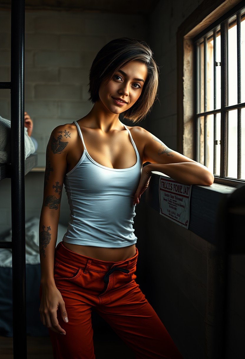 downbluse, nipslip, Inside a young 25-year-old Latina woman is present in the scene. She strikes a sexy pose, with her body slightly tilted as she leans against the wall next to the bunk. She’s wearing a white tank top and (dark orange pants:1.5). (Her hair is very short:1.4), blue eyes, perfecteyes, which appears both sensual and smile. Tattoos of crosses, stars, and sacred images are visible on parts of her body. The dim light filtering through the barred windows casts sharp shadows across the room, creating a contrast between the stark environment of the dormitory and her alluring pose. The image is rendered in a realistic style, capturing the tension between the tough surroundings and her presence