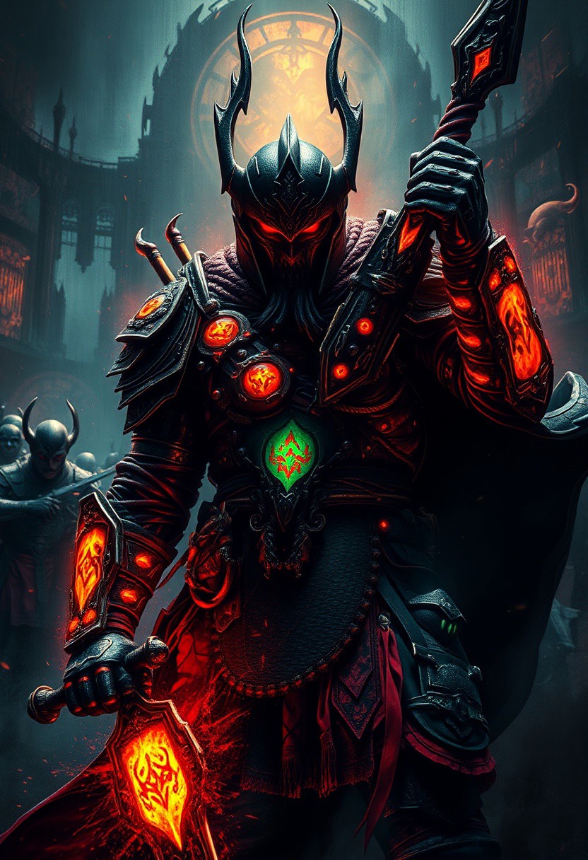 Epic dark fantasy vibrantly colored hyperdetailed ink art depicting a legendary warrior in defiance against impossible odds. Strong top lighting effect. Bioluminescent glowing armor and weapon accessories. Volumetric lighting. Chiaroscuro oil painting by Caravaggio. Deep glow effect, cinematic light bloom, cinematic lens flare. Grimdark, gritty, intense, volatile. Hypermaximalism. Motion blur. Full-frame fisheye lens. 32K cinematic hyperrealistic fantasy ultradetailed masterpiece.
