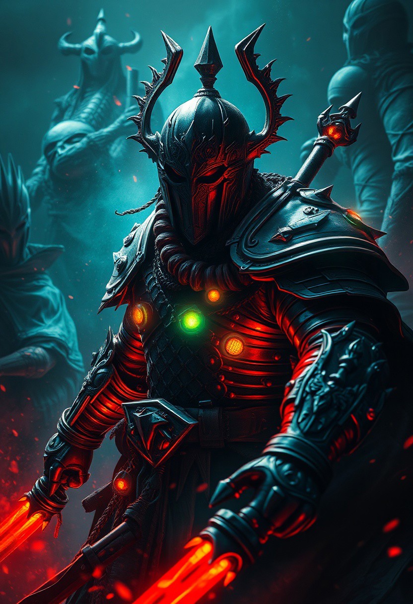 Epic dark fantasy vibrantly colored hyperdetailed ink art depicting a legendary warrior in defiance against impossible odds. Strong top lighting effect. Bioluminescent glowing armor and weapon accessories. Volumetric lighting. Chiaroscuro oil painting by Caravaggio. Deep glow effect, cinematic light bloom, cinematic lens flare. Grimdark, gritty, intense, volatile. Hypermaximalism. Motion blur. Full-frame fisheye lens. 32K cinematic hyperrealistic fantasy ultradetailed masterpiece.