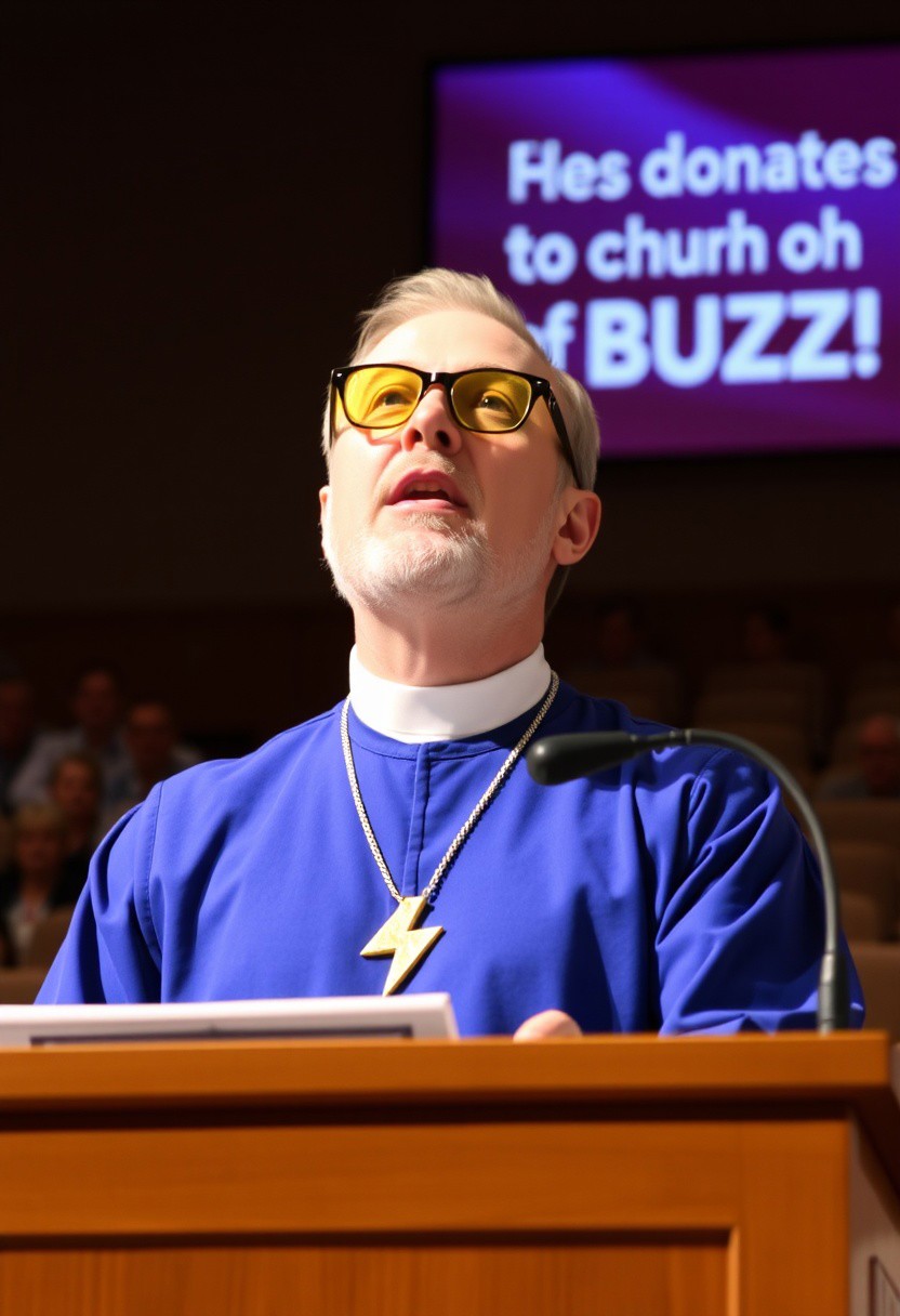 Man wearing yellow tinted glasses and a blue priest uniform inside auditorium behind podium preaching, he is wearing golden lightning bolt symbol necklace prominently visible, behind him is a sign with text "Please donate to the church of BUZZ!". No cross symbol.