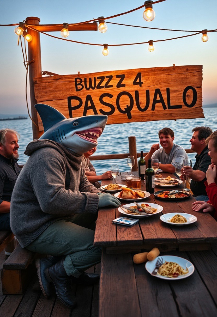 An Italianized humanoid shark named ‘Pasqualo,’ with a muscular body, gray shark-like skin, and sharp teeth, sits at a large wooden table on a seaside pier during sunset. He has black eyes, a prominent dorsal fin, and a friendly grin. Dressed in a rugged fisherman’s outfit, including a weathered wool sweater, rolled-up pants, and boots, Pasqualo blends seamlessly into the scene with his human fisherman friends. They laugh and chat around the table, their sun-baked skin and salt-worn clothes reflecting a life spent at sea. The table is covered with rustic Italian seafood dishes: grilled fish, steaming bowls of pasta, crusty bread, and wine bottles. Half-filled glasses suggest recent toasts, and plates are scattered in a laid-back, festive atmosphere. Overhead, warm string lights cast a golden glow on the gathering. In the background, a large wooden sign, slightly worn and hand-painted, reads ‘BUZZ 4 PASQUALO.’ It’s mounted on a weathered post with a couple of seagulls perched on top. The sea behind them is calm, with fishing boats gently rocking in the harbor. The setting captures the authentic feel of an old Italian coastal town, with Pasqualo smiling and enjoying the meal with his closest friends, blending the fantastical with the familiar and realistic