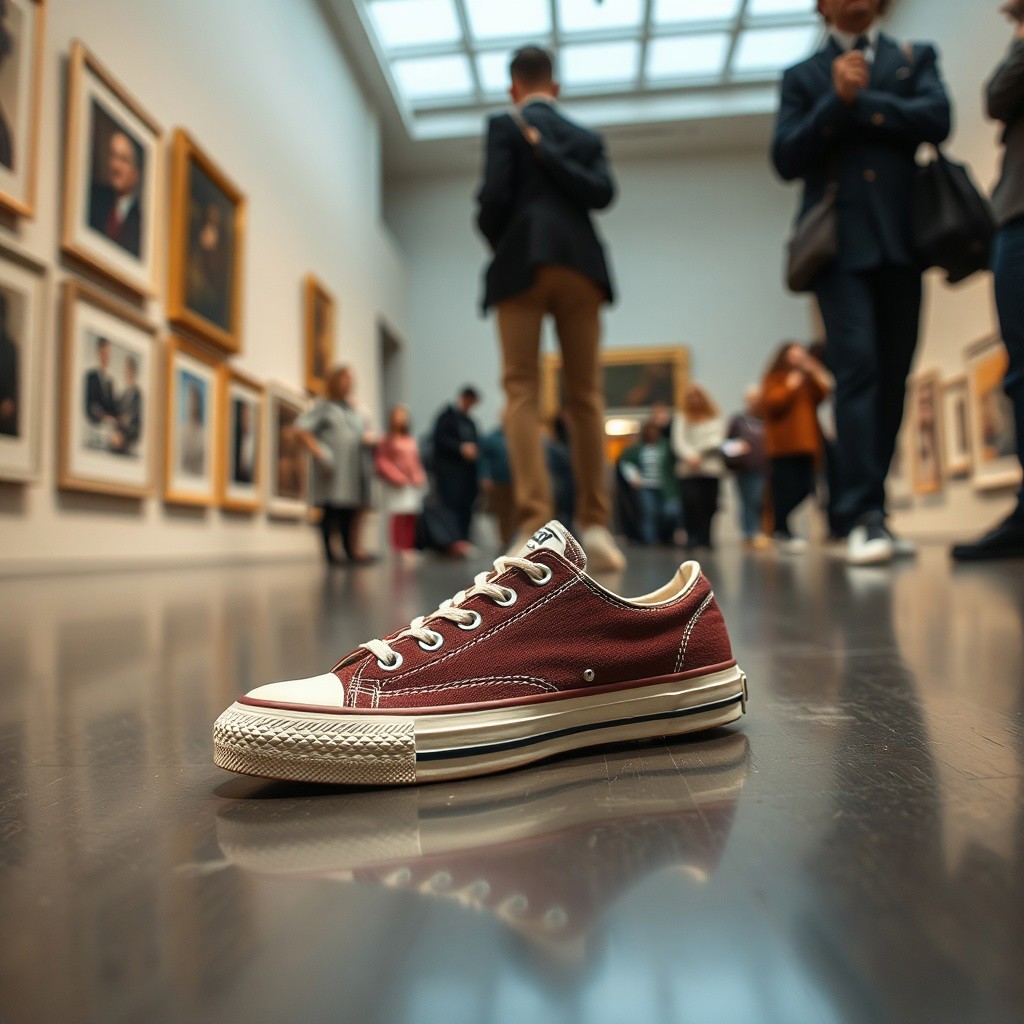 an art exhibition in which a tennis shoe is being displayed as a work of art, the tennis shoe is on the floor, and the public, which is rich, is around it