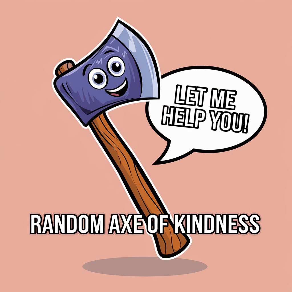 poster of a cute axe with speech bubble "Let me help you", below the axe the title says "Random Axe of Kindness"