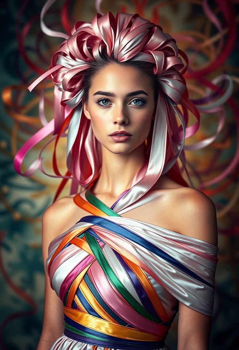 A surreal photo of a young woman whose hair is made entirely of ribbons. Facing the camera, the wide lengths of satin ribbons emerge from her scalp and fall gracefully down her head and face and over her shoulders. The ribbons begin to form intricate woven patterns that fall over her chest and torso and wrap around it, becoming an elegant satin gown made of multicolored woven ribbons. The background features abstract, swirling patterns of color and light, creating a sense of movement and energy.