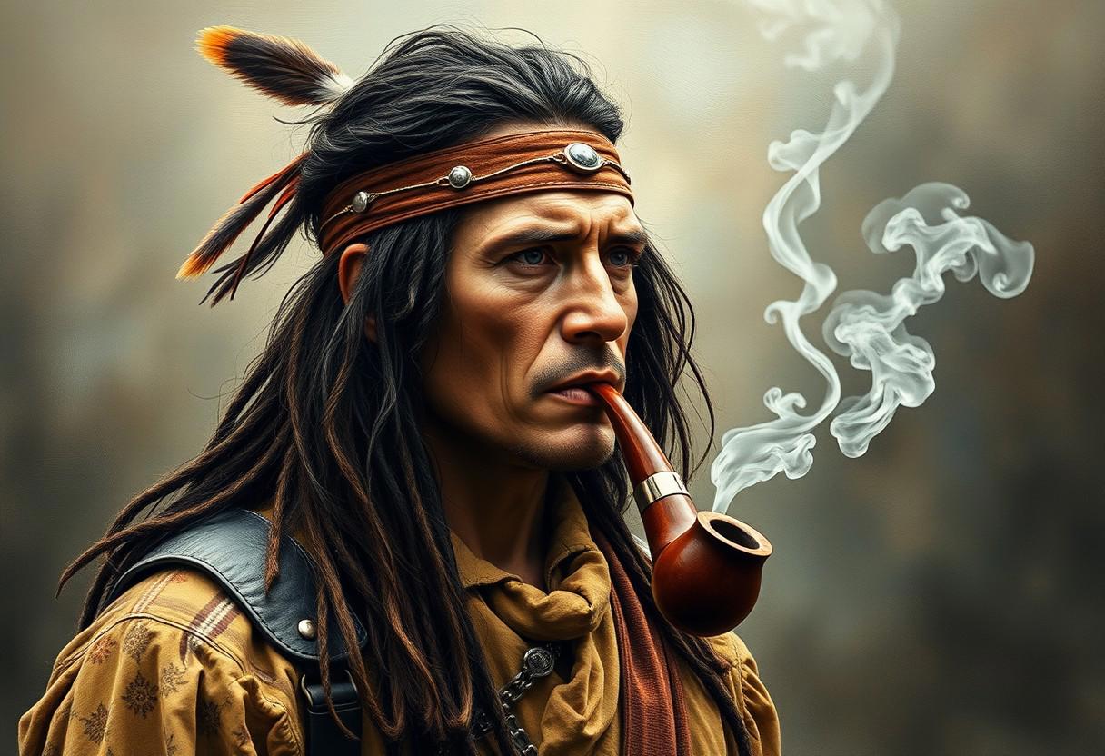 masterpiece, a painting made of precious stones, full body shot, score_9, score_8_up, score_7_up, (best quality:1.1),ultra-detailed, high resolution, super detailed , cinematic, hyperrealistic, The last of the Mohicans with a smoking pipe, text"The last of the Mohicans"