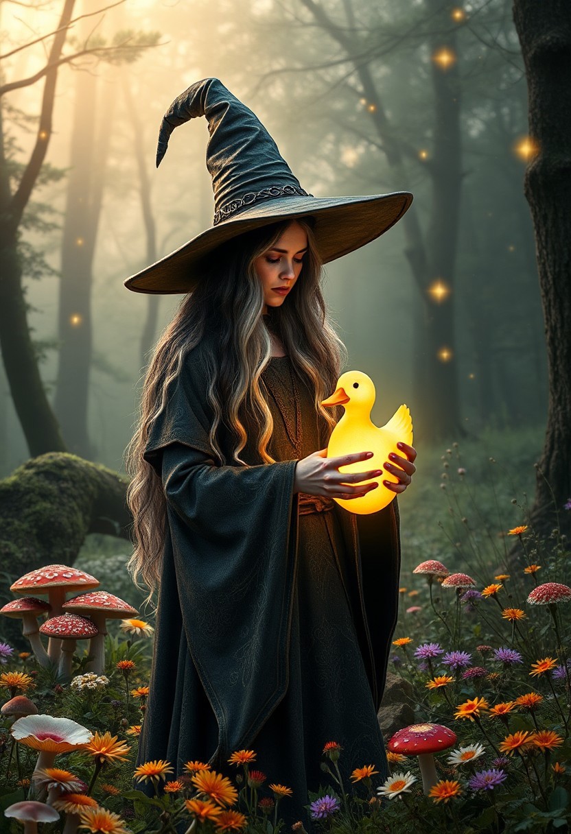 "A mystical witch with long black and silver hair and a tall, weathered hat stands in an enchanted forest, carefully tending to a glowing, magical duck. The scene is set in a misty forest at dawn, colourful mushrooms and flowers with soft, diffused light filtering through the trees. The witches robes are adorned with intricate, druid patterns, and the air is filled with golden, sparkling particles of magic. The atmosphere is one of wonder and ancient knowledge, with a sense of timelessness and serenity."