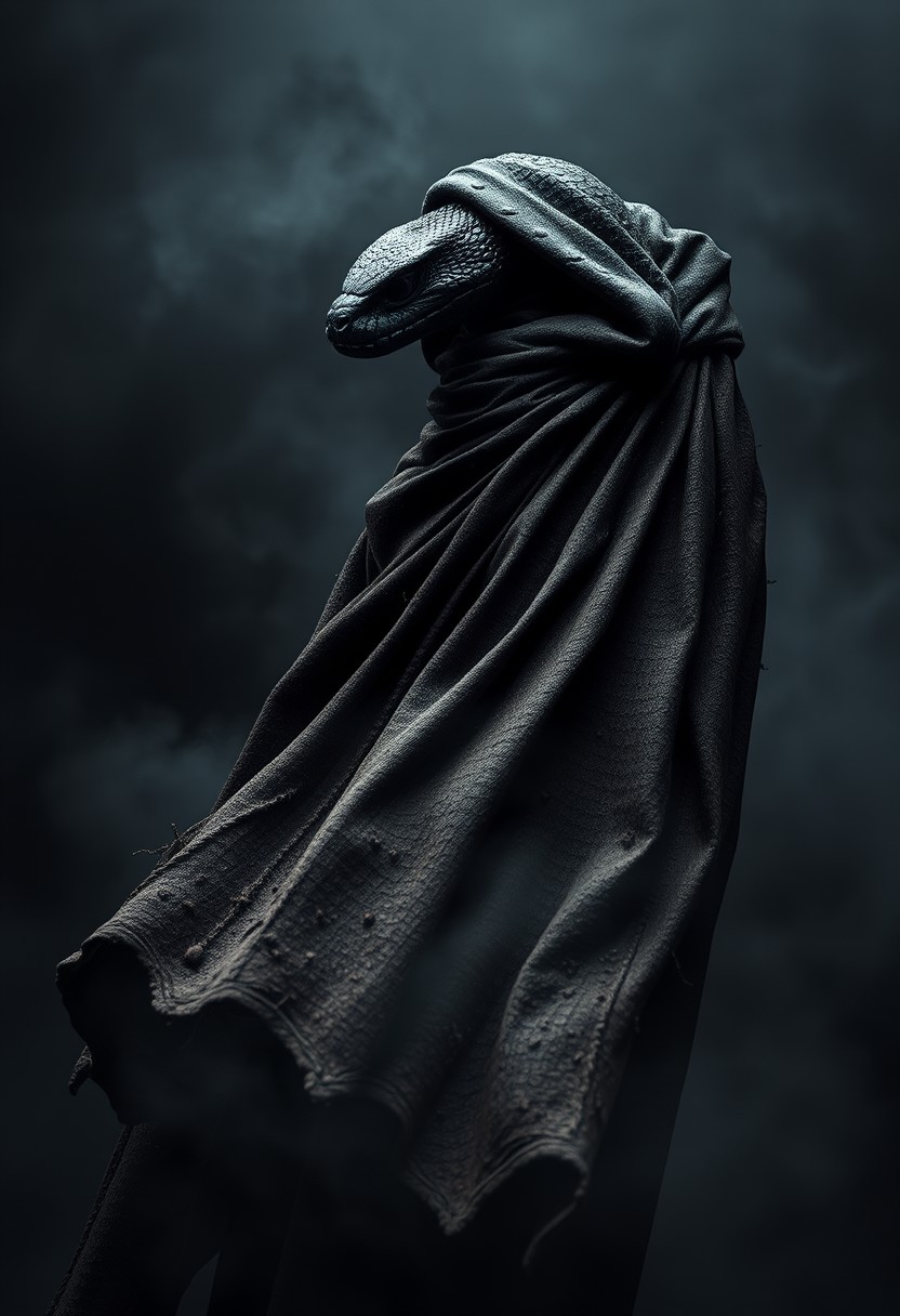 black snake beast wearing a grunge and dirt cape, Dark Style, gothic Style, long cape, wind, dark background, mist, photography studio style, hyper realistic, ultra detailed