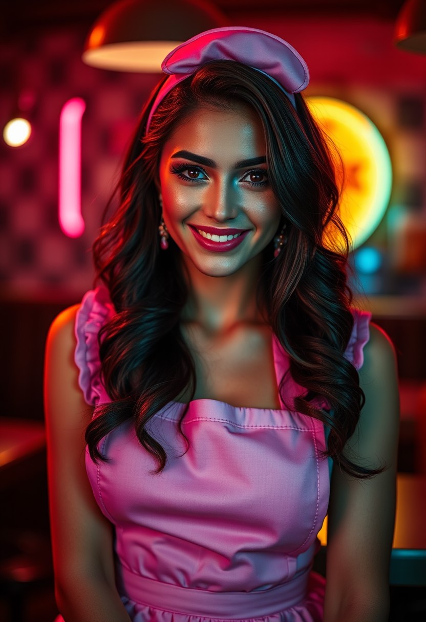 realistic photographic of a stunningly beautiful woman, a charming pin-up waitress model, sporting a vibrant pink uniform with a playful apron, engaging, flirty smile, atmospheric, irresistible gaze, sexy, masterpiece, best quality, dark and light neon mix, masterpiece midjourneyv6.1, volumetric lighting, expressive, warm colors, extreme energy, dynamic posing,