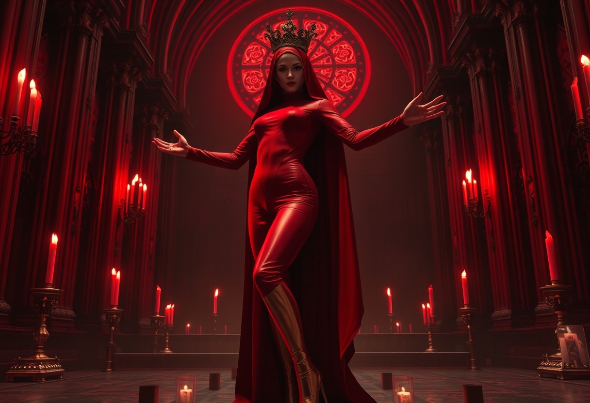((score_9, score_8_up, score_7_up)), (((character design, sci-fi warrior women, feminine power, perfect anatomy))), An enigmatic figure of a (occult)nun(caucasian), her red (skintight_sealed_bodysuit)habit sexy, conducting a sensual occult ritual inside a dark cathedral at (red)midnight. Her (eyeless)mask, elaborate crown, (fully)conceals her identity, adding to her mystique and allure. gold stiletto platform thigh boots, big breasts, tiny waist, flat abs, naughty, looking at viewer, seducing with her body, dancing towards viewer with her arms extending up, sexy ass seductive wide hips, butt cheeks, twerk, huge perky breasts, in the style of a vintage, high-contrast setting. Emphasize theatrical elements with a bit of bright colors against dark, moody backgrounds ,big butt, booty, bubble butt, <lora:add-detail-xl:2>