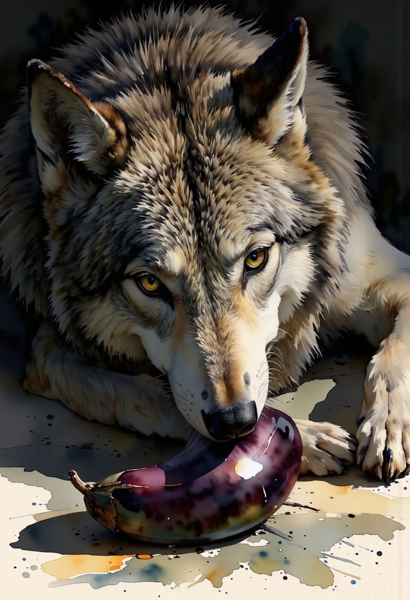 A gray wolf eating an eggplant, dramatic, exaggerated, atmospheric, passionate, watercolor painting, color palette focusing on purple/orange/teal with black and yellow accents