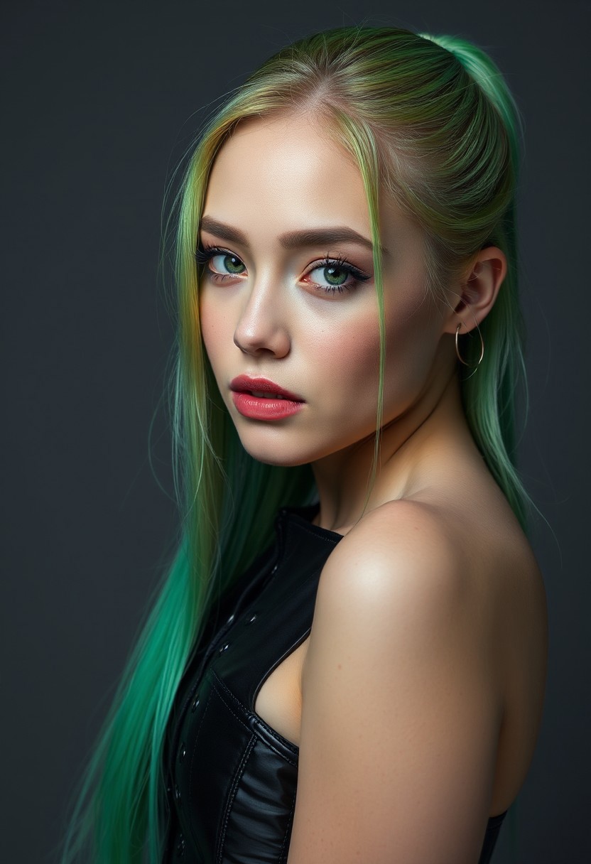 score_9, score_8_up, score_7_up, score_6_up, score_5_up, score_4_up, 1woman, RAW photo, (freckles:0.8), long ponytail, neon green hair, medium close-up shot side view, latex corset (busty 44d:1.5), extremely detailed, beautiful detailed green eyes, full lips, pale skin, neutral expression, neutral gray background, studio lighting , in the style of (kyuYong Eom:1.0)