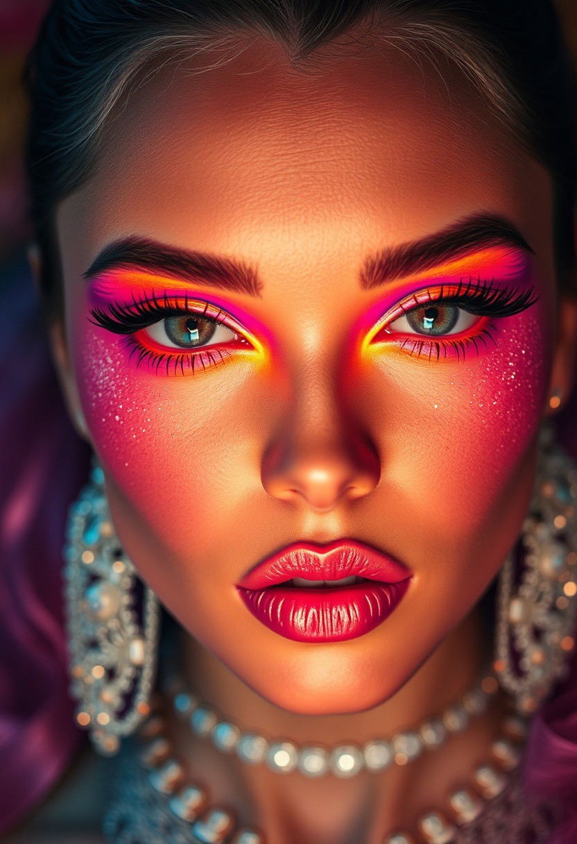 high-definition, glowing highlighter, neon eyeshadow, (overexposed:-1), dynamic lighting, close-up face, heavy contouring, (lowres:-1), (dull:-1), extreme glam, (subtle makeup:-1), rhinestone embellishments, (blurry:-1), vivid blush, (sharp focus), (muted colors:-1), (flat lighting:-1), bold colors, glitter lips, studio lighting, maximalist makeup, (good anatomy:1.4), perfect skin, ultra-realistic, beauty photography, detailed textures, cinematic, dramatic eyeliner, (high-fashion makeup:1.2), vibrant colors, overlined lips, (bad anatomy:-1.4), (high resolution:1.3), surreal beauty, hyperrealistic, (oversaturated:1.2), exaggerated glow, piercing eyes, bold contours, vibrant neon hues, reflective textures, iridescent highlights, shimmering face jewelry, maximal embellishments, glossy skin, exaggerated cheekbones, over-the-top makeup artistry, intricate eye details, multi-layered contouring, excessive glam, intense blush, glowing from every angle, highly polished, magazine cover quality, photo-ready perfection, absurd detail level, almost otherworldly glow, ultra-luxurious makeup application, layers of vivid color