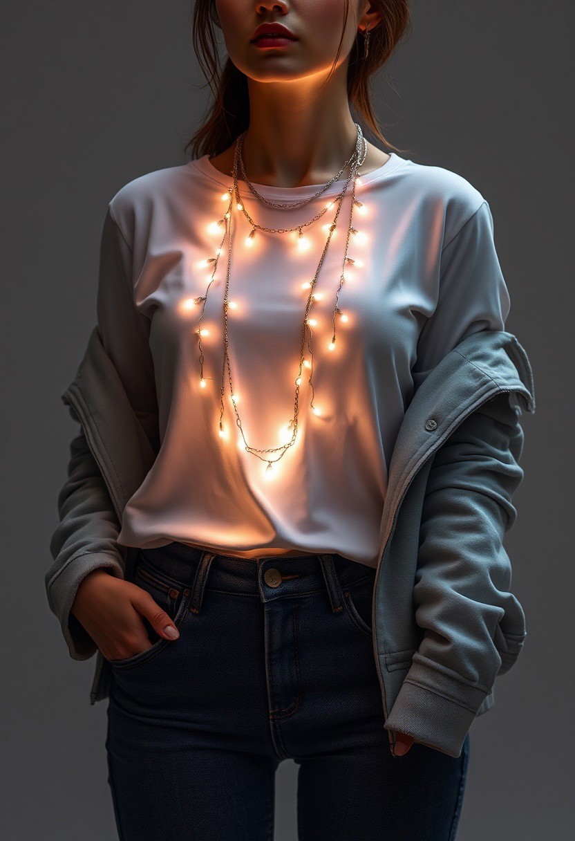 subdermal LED cascade necklace, (internal LED glow:1.7), (embedded LEDs:1.8) forming cascading, layered light patterns beneath the skin, (soft glowing strands:1.6), paired with casual chic attire, (simple white t-shirt:1.3), (high-waisted jeans:1.4), (ankle boots:1.3), (light makeup with glowing skin:1.2), (minimalist jacket:1.3), high-definition, (ultra-realistic textures:1.7), glowing cascade light pattern enhancing the casual look, modern yet subtle, (worn jewelry:-1.8), (chains:-1.8), (rigid design:-1.5), (overexposed light:-1.4), tech-inspired beauty