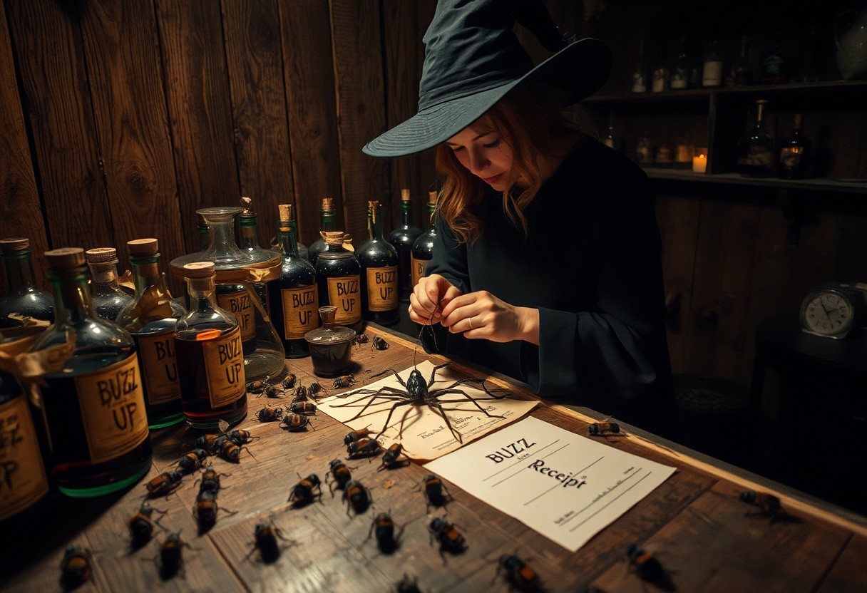 a woman is disassembling insect limbs, wearing witch cap and black long dress, focused on her work, in a wooden room full of potion bottle labelled ("BUZZ UP"), the potion glows, on the table there are papers saying ("BUZZ Receipt"), dead bees scattered on the table, cinematic lighting, dark contrast, old and rusty environment