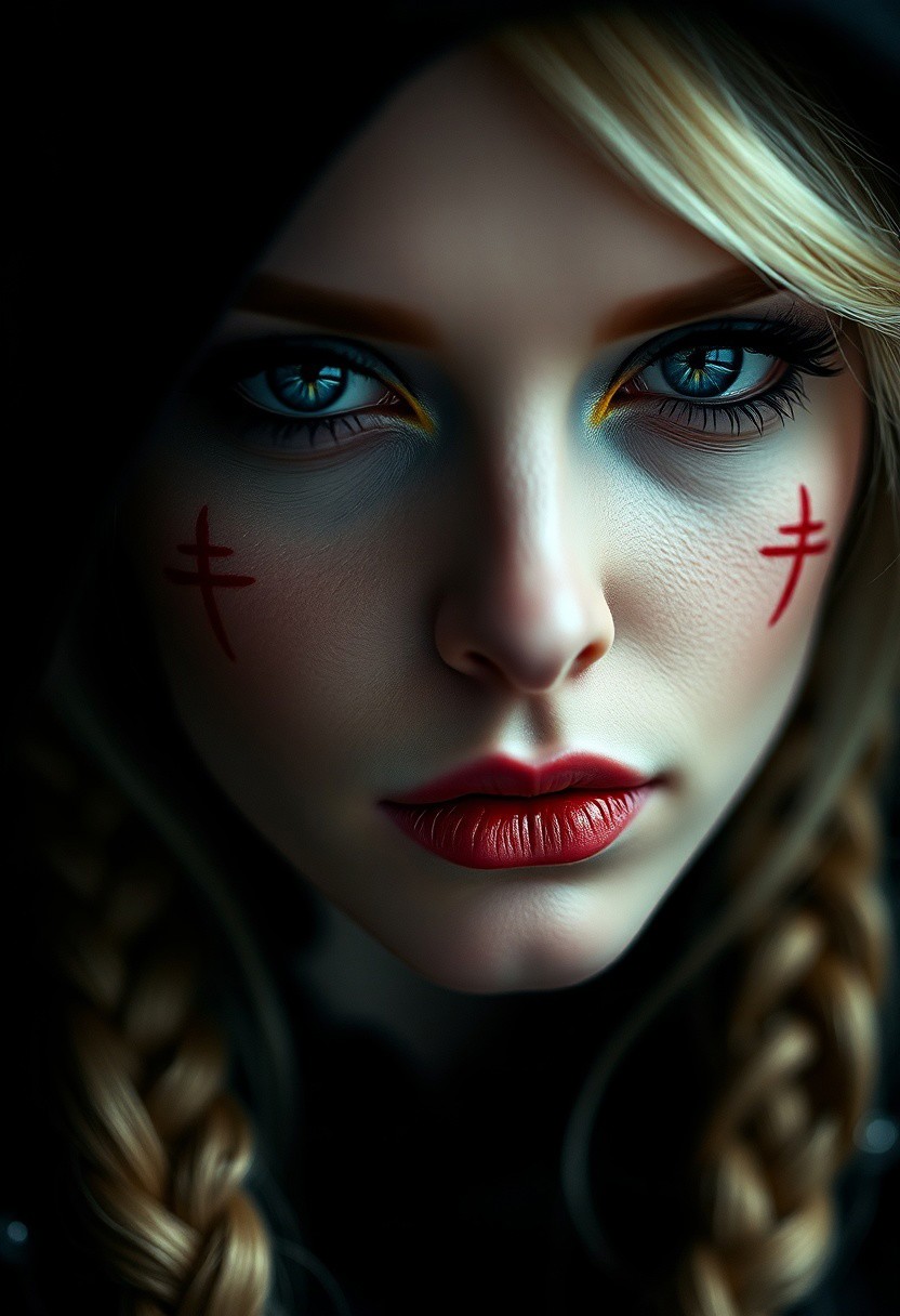 masterpieces, close-portrait, female, makeup, pale skin, blonde hair, braided hairstyle, mysterious, red black symbols, glossy blue eyes,best quality,masterpiece