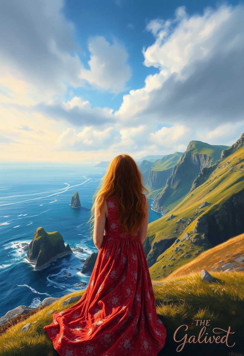 The Galway girl and a spectacular, rugged west coast of Ireland scenery, a majestic oil painting