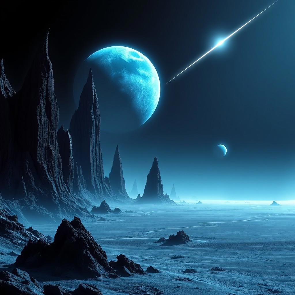 Digital artwork of a futuristic, alien landscape. The layout features towering, jagged spires of dark rock formations in the foreground and midground, with a vast, barren plain stretching into the distance. The sky is dominated by a massive, glowing blue planet with visible craters, accompanied by a smaller moon. A bright meteor streaks across the sky, adding a dynamic element. The color palette is predominantly cool tones of blue and black, with subtle highlights of white and grey. The overall atmosphere is otherworldly and surreal, evoking a sense of awe and mystery.