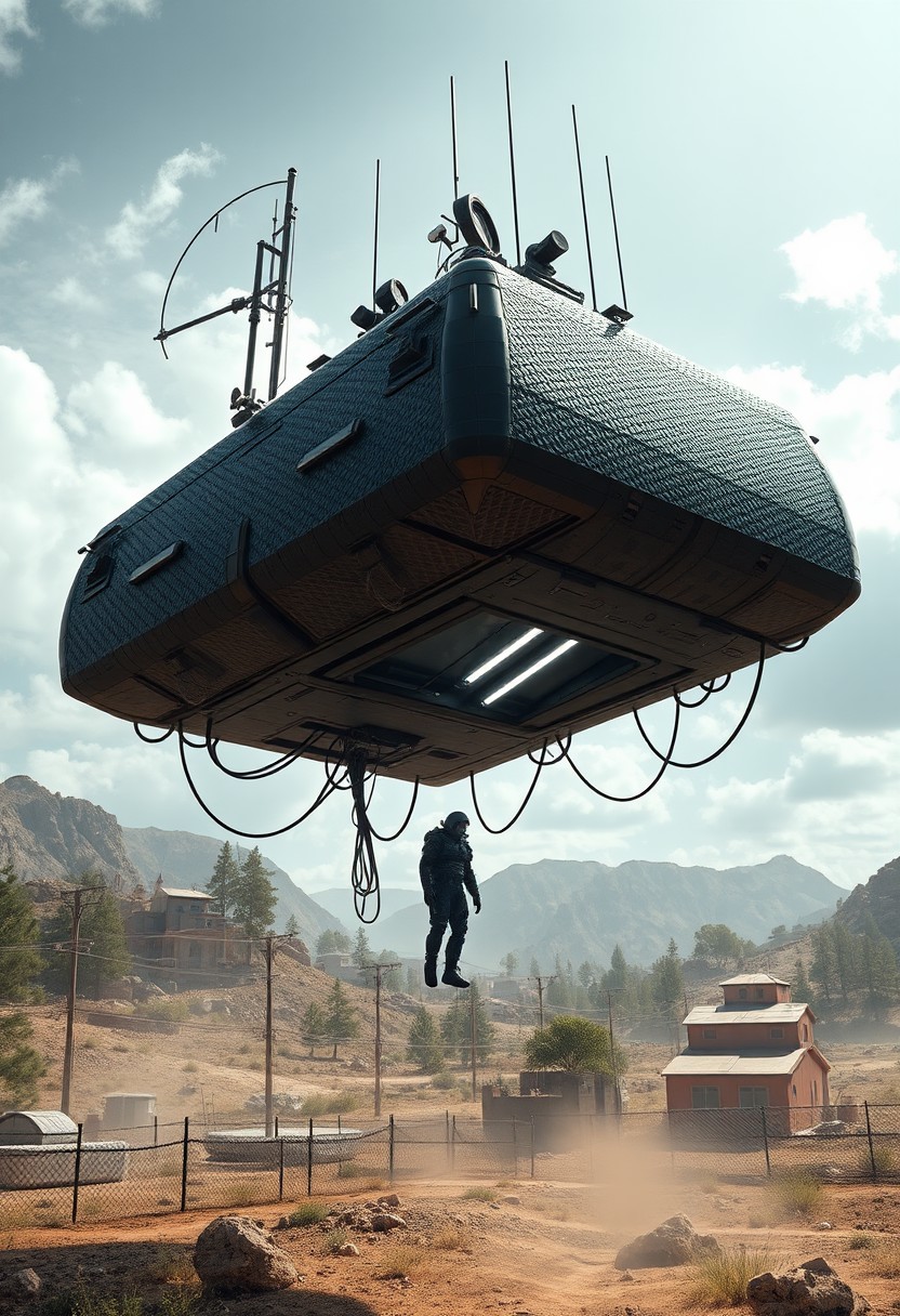 ultra high resolution, masterpiece, best quality, small featureless angular glossy black spacecraft with a heavily textured surface hovering low to the ground, underneath the spacecraft are cables hoses and wires, antennas on top, cables hanging from below, rectangular in shape, futuristic world, post apocalyptic landscape, anti gravity, in the atmosphere, sky, clouds, ground visible, hovering, green trees and hills, rocky outcroppings, small buildings, chain link fence, small open entrance ramp at the lower edge of spacecraft, soldier in dark armored spacesuit debarking from a brightly backlit entrance, bright noon sun, dusty