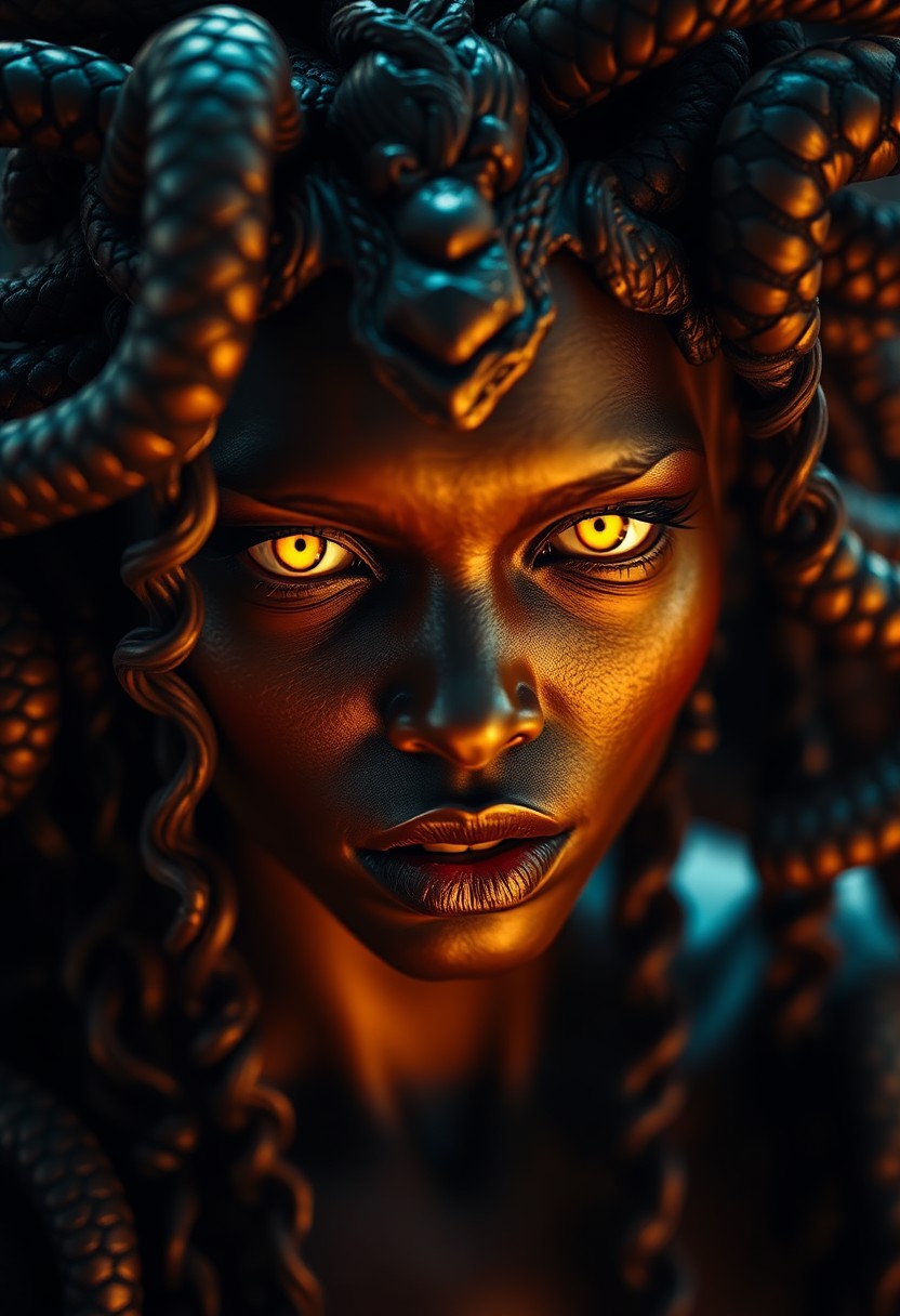 Modern, 2020s, detailed cinematic shot from, realistic cinematic scene, dark brown black woman portrays Medusa, the gorgon woman with writhing snake hair, full lips glowing yellow eyes, no pupils, Intricate, Sharp focus, Highly detailed, Fantasy, Dark lighting, ominous mood., realistic Medusa high saturation, Bright, Vibrant, full of action, Very stylish, far shot, full body, showing detailed intricate work, shot in the style of wes anderson and stephen king, oscar winning photography, striking image captures, meticulous attention, stunning costume design
