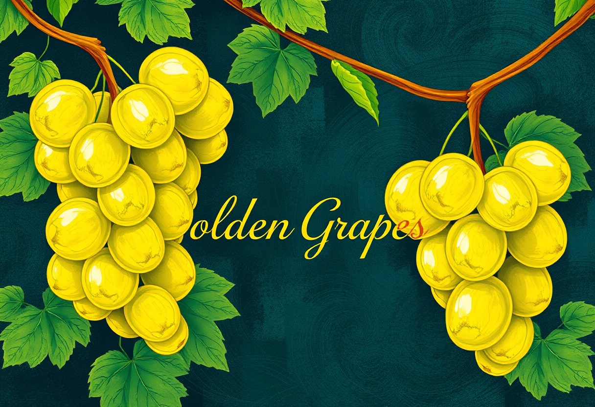 Create an elegant, Van Gogh-inspired illustration for the Shine Muscat grape brand 'Golden Grapes.' The design should feature vibrant, golden-green grapes with a slightly transparent skin, arranged naturally with fresh vines and swirling, expressive lines in the background. The color palette should be reminiscent of Van Gogh's use of vivid, textured brushstrokes, with rich greens, yellows, and deep blues. The brand name 'Golden Grapes' should be subtly integrated into the design in an artistic, luxurious font. The overall effect should evoke a sense of fine art, with a modern, high-end twist, emphasizing the premium quality of the product.