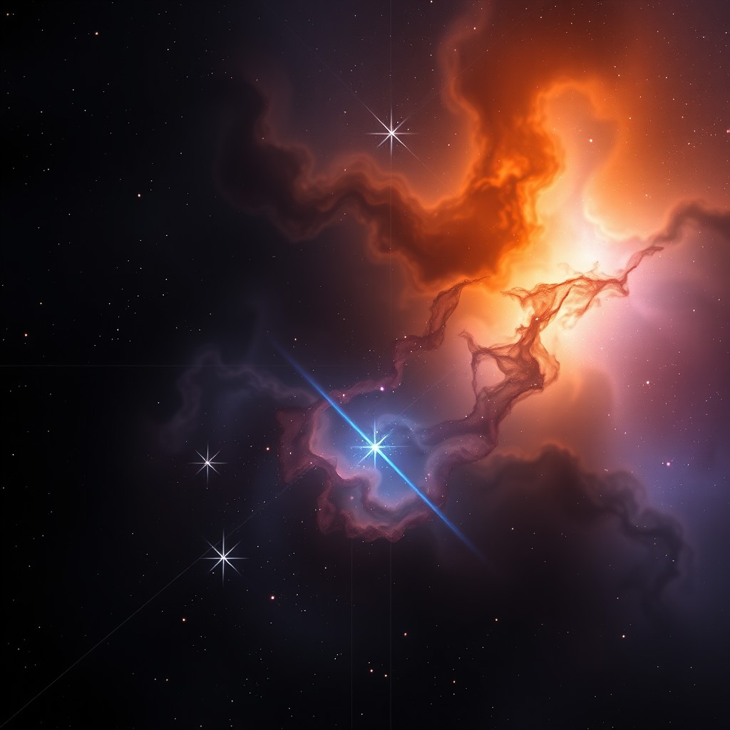 photorealistic dark translucent cosmic nebula in hues of black, orange, blue, and purple, and with 6 diffraction lines on stars