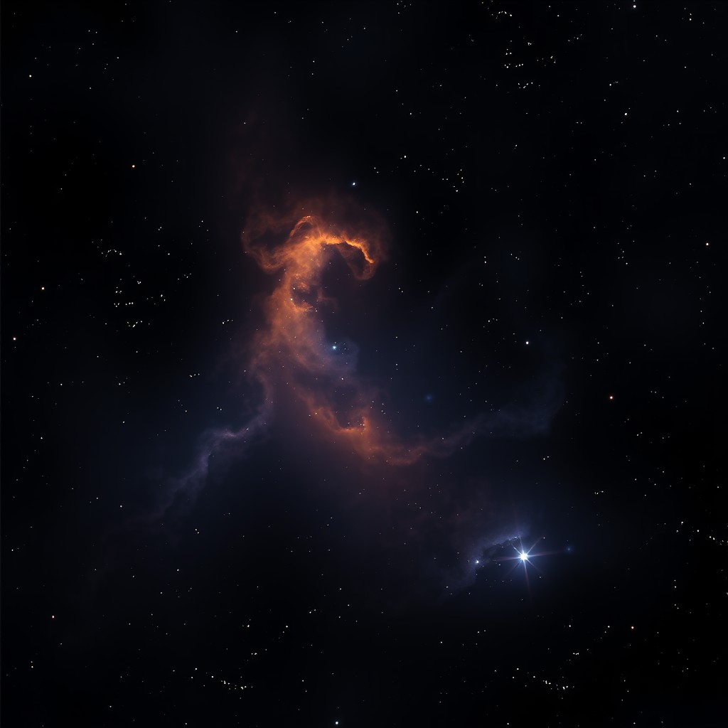 photorealistic dark translucent cosmic nebula in hues of black, blue, orange, and purple, and with 6 diffraction lines on stars