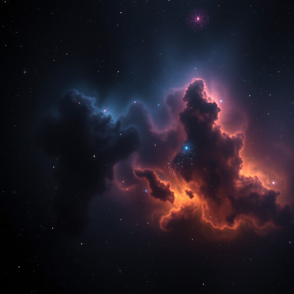 photorealistic dark translucent cosmic nebula in hues of black, blue, orange, and purple, and with 6 diffraction lines on stars