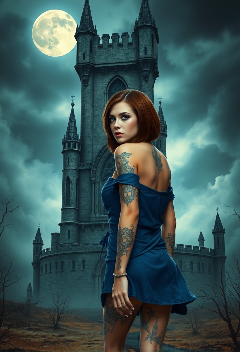 Digital fantasy artwork depicting a woman with fair skin and short, straight, brown hair, she has blue eyes and is wearing heavy makeup, including dark eyeshadow, eyeliner, and pink blush, wearing a short blue tunic revealing mystical tattoos on her arms and legs. She is walking away from a towering, intricately designed gothic castle is set against a dark, stormy sky with a full moon. The castle has a weathered, ancient appearance, giving it a mystical and eerie ambiance. The structure is surrounded by a barren, desolate landscape. The overall mood is dark