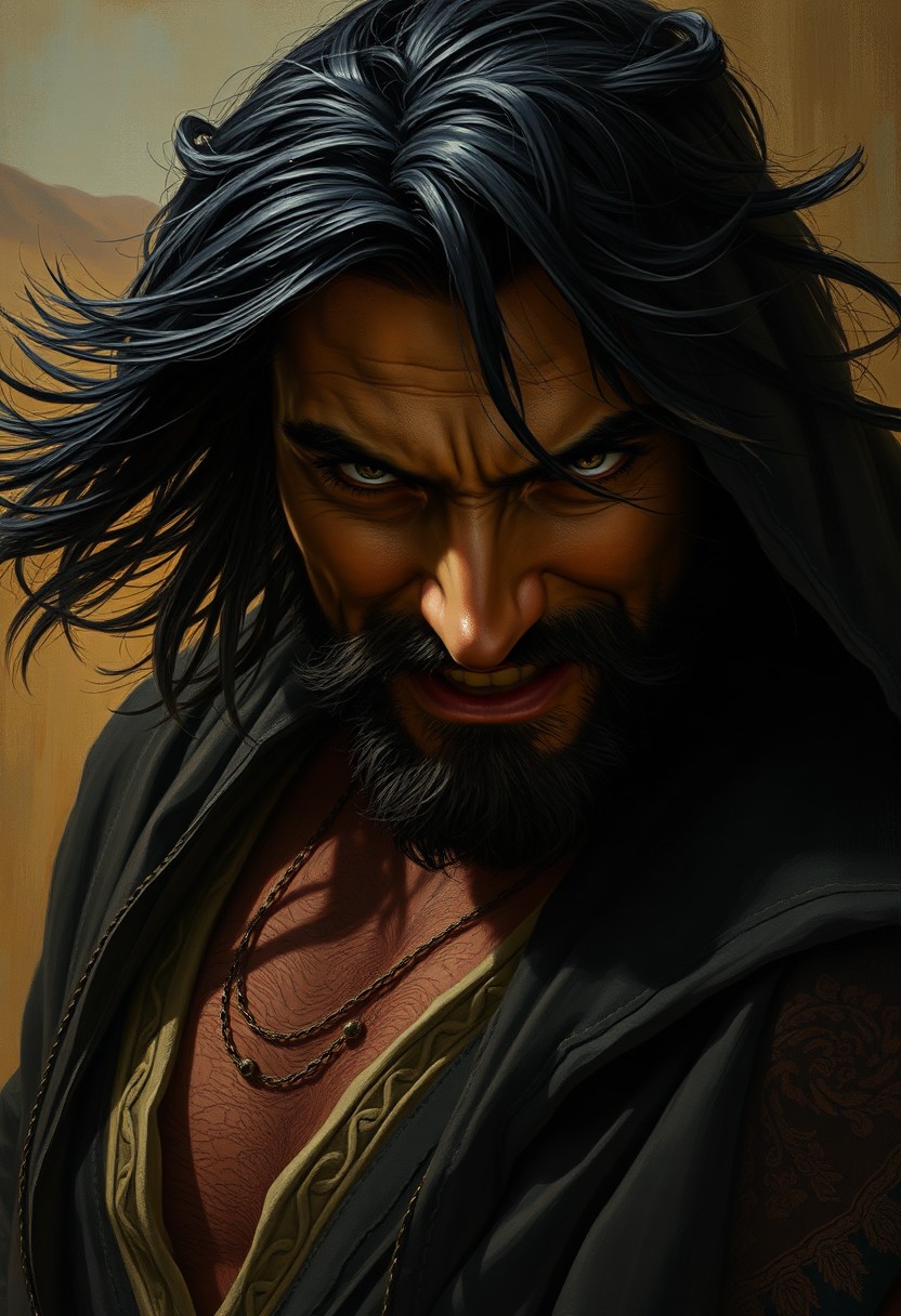painting by gaston bussiere, craig mullins and Gabriele Dell'otto, portrait of middle aged handsome rugged malevolent Arabic male sorcerer, dark, lavish clothes, fantasy, mystical, smirk, strong side lighting, long floating black hair, hairy chest and abs visible, thick lips, mouth a bit open, desert background