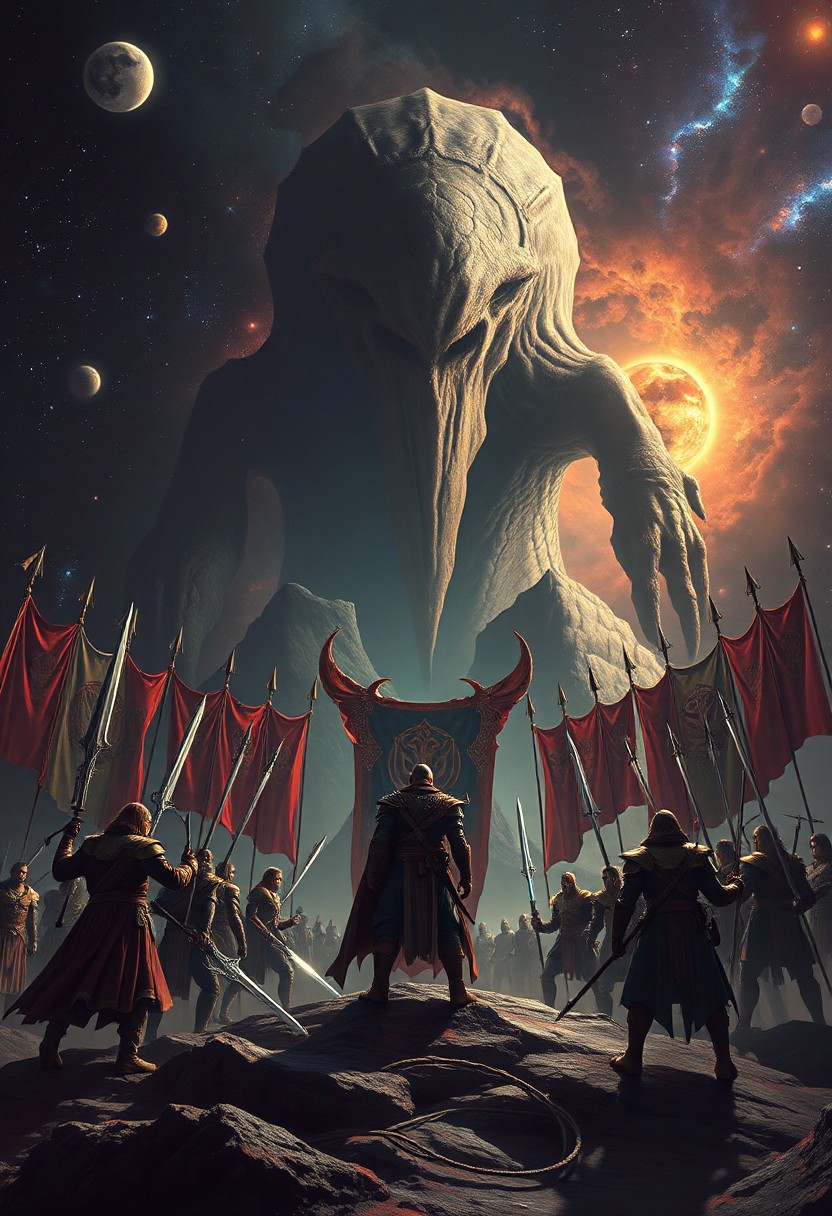 lovecraftian horror, At the edge of our galaxy, a grand assembly of cosmic warriors converges upon a dark nebula, to confront a malevolent extraterrestrial force looming ominously in the background a colossal entity poised to wreak havoc across the stars, As they ready themselves for battle, each fighter stands tall amidst their respective planetary banners, their weapons glinting under distant suns, style of Edward Blair Wilkins . eldritch, cosmic horror, unknown, mysterious, surreal, highly detailed