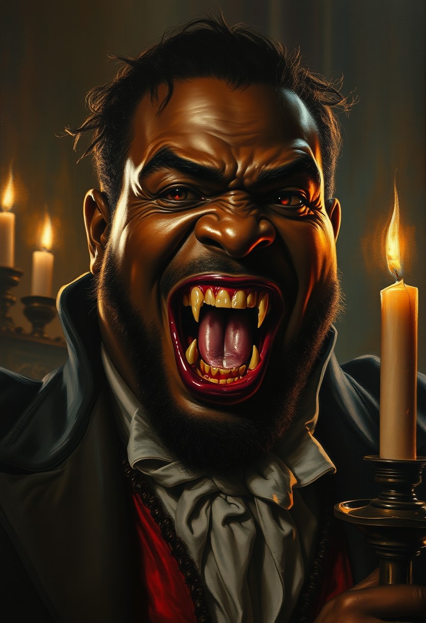 painting by gaston bussiere, craig mullins and Gabriele Dell'otto, afroamerican musclechub vampire in XIX century New Orleans, upper body portrait, detailed facial features, big grin, open mouth with fangs, high texture, rich colors, historical, gothic horror, dramatic lighting, dim candlelit ambiance, intricate costume, ominous atmosphere, heavy brushstrokes, vintage, eerie, mysterious, 4k, ultra-detailed, historical, gothic horror, dramatic lighting, dim candlelit ambiance, artistic oil painting stick