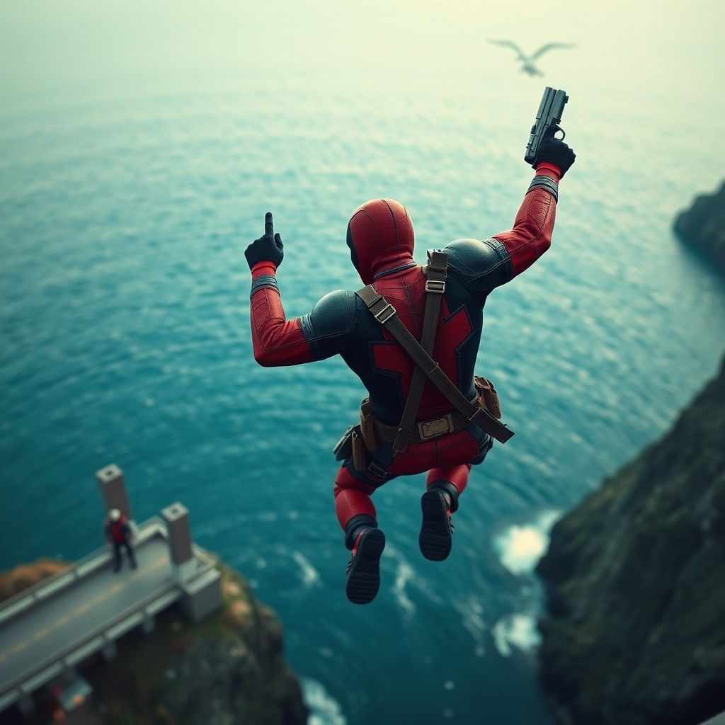 Deadpool is jumping from a bridge in a sea, bird person oponion , super focus on male, superrealistic, in his right hand he has a gun, you are not so near by deadpool, you see his back