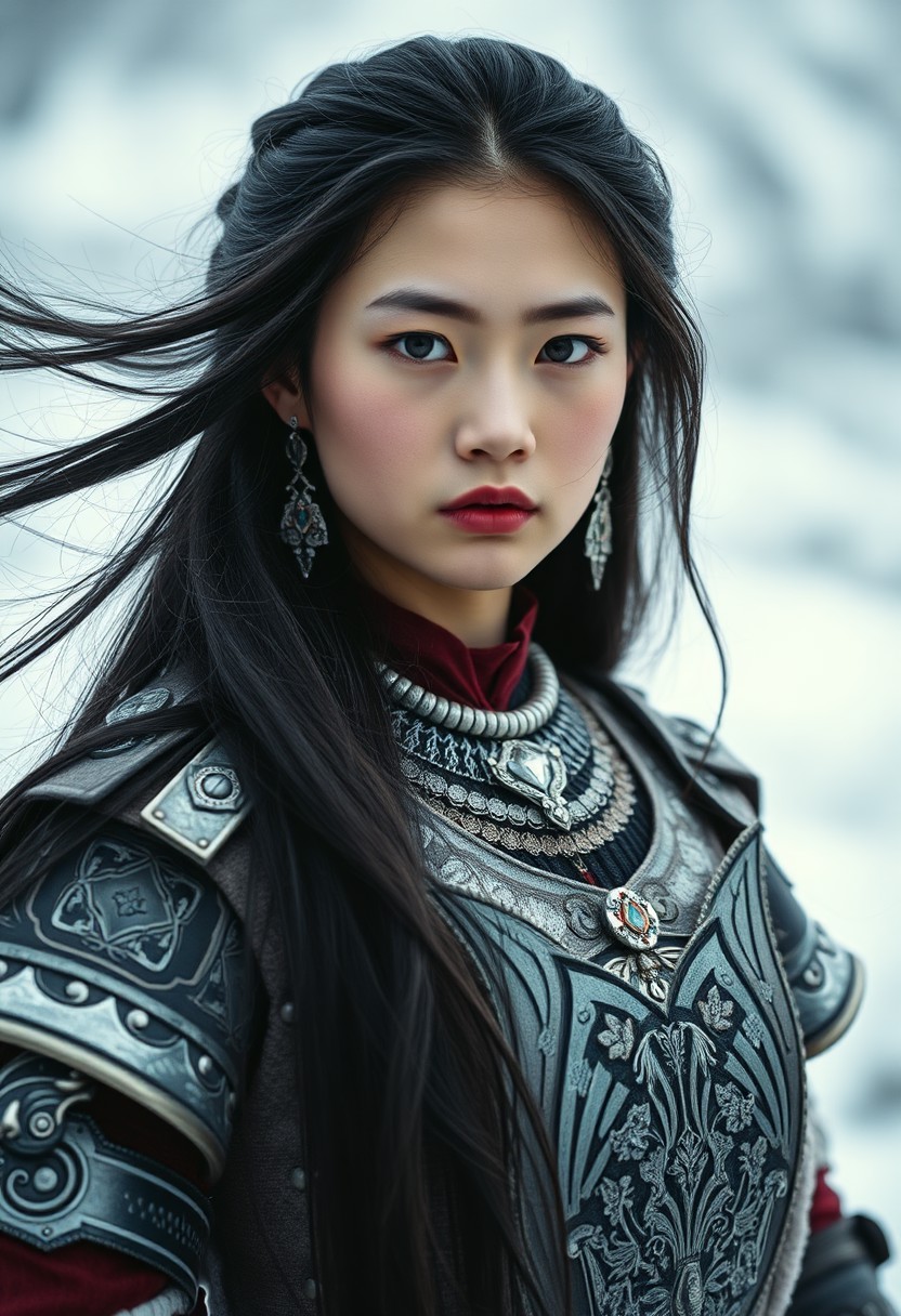 symmetrical full shot of a mongolian warrior girl, standing pose, long hair, black hair, jewelry, red eyes, makeup, red lipstick, pale skin, white skin, armour, earrings, wearing elegant costume, in the moutains at winter, winter, snow in the background, skin texture, best quality, ultra-detailed, analog style, cinematic light, sidelighting, ultra high res, serious expression , closed mouth, wind, mist