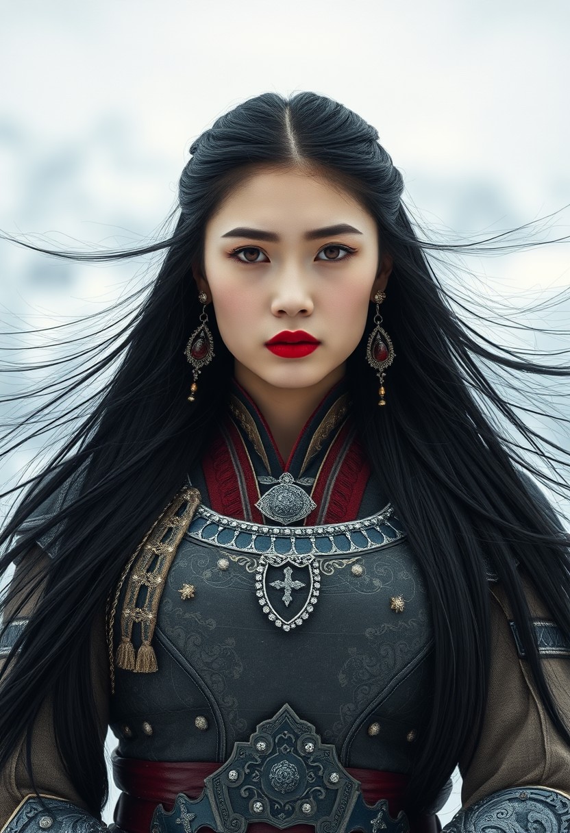 symmetrical full shot of a mongolian warrior girl, standing pose, long hair, black hair, jewelry, red eyes, makeup, red lipstick, pale skin, white skin, armour, earrings, wearing elegant costume, in the moutains at winter, winter, snow in the background, skin texture, best quality, ultra-detailed, analog style, cinematic light, sidelighting, ultra high res, serious expression , closed mouth, wind, mist