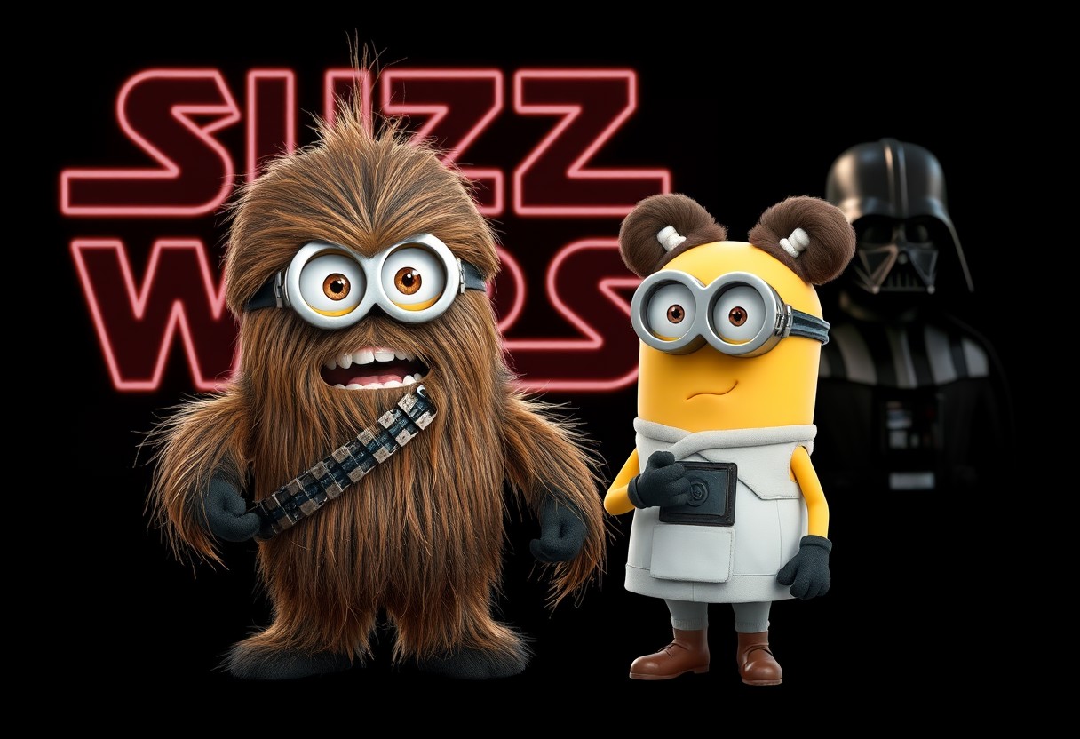 A minion from Despicable Me transformed into a Chewbacca-inspired creature, covered head to toe in thick, shaggy fur, blending the iconic features of a Wookie with the playful charm of a minion. Wearing a rugged ammo belt across its chest, the character strikes a powerful stance, mid-roar, exuding fierce energy. Next to this Wookiee minion stands a minion styled as Princess Leia, complete with her signature buns and white robes, adding a whimsical twist to her regal look. In the background, a dramatic sign reads ‘BUZZ WARS’ in a bold, Star Wars-style logo, glowing with a futuristic flair. To complete the scene, Darth Vader appears in all his imposing glory, adding a dark, commanding presence. Set against a pitch-black backdrop, the image shines in cinematic, 4K quality, creating a visual masterpiece that blends epic and whimsical elements with intricate details in texture, expression, and character design.