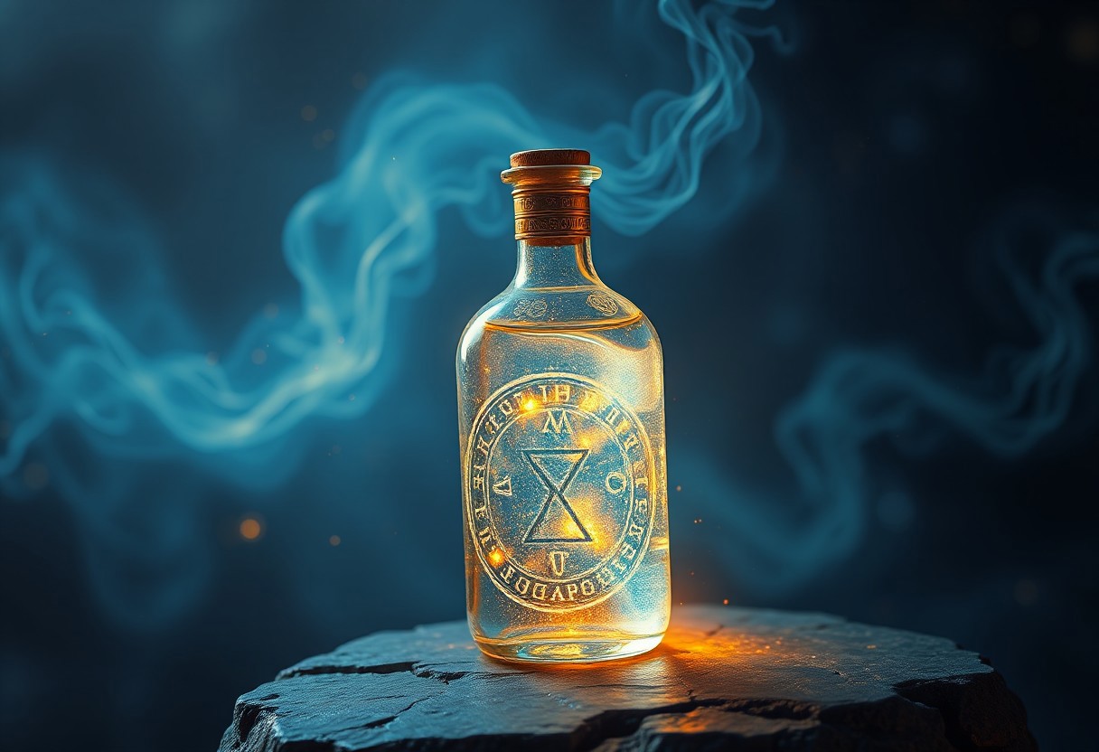 ancient mana potion, glowing ethereal liquid, shimmering with mystical energy, crystalline bottle, intricate runes carved into the glass, celestial blue and golden hues, softly glowing vapor rising from the potion, suspended particles of light within the liquid, swirling magical essence, divine aura, sacred elixir of the gods, delicate floral and herbal aromas, golden cap adorned with ancient symbols, floating in mid-air, surrounded by soft magical light, radiant energy pulsating from the potion, high resolution, photorealism, ((masterpiece)), aura of divine power, ancient and revered, soft glowing runes on the bottle's surface, potion bottle resting on a stone altar, cosmic patterns swirling in the potion, shimmering like the night sky, mythical ingredients infused within