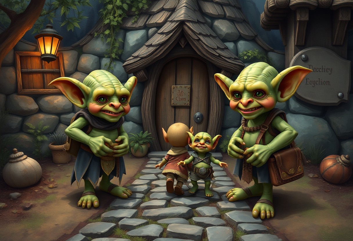 proud goblin parents, first day of fantasy preschool, staying to watch their goblin child walk up the cobblestone entry path that leads up to the preschool's front door, possibly a witch's hut. imaginary slice-of-life, fantasy art, ultra-detailed, high resolution, emphasizing facial expressions, visual storytelling technique, quixotic, colorful,