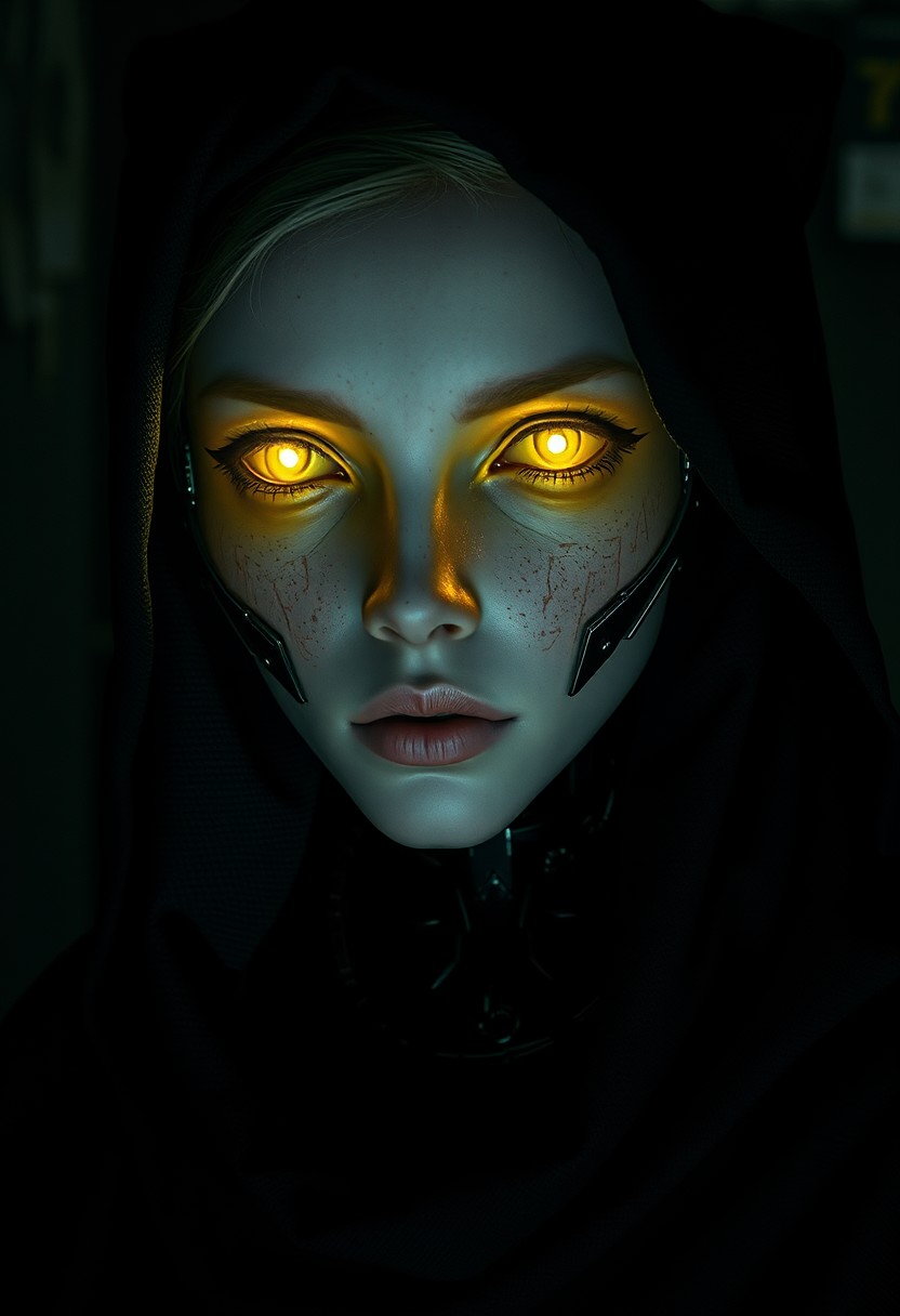The image depicts a photorealistic portrayal of a young woman humanoid figure with a highly detailed and eerie appearance. The character's face is a blend of human and robotic features, with a smooth, metallic surface covering parts of the skin. Mechanical elements are visible around the eyes and cheeks, hinting at a cybernetic or android identity. The eyes glow bright yellow, emitting an intense, almost otherworldly light, contrasting with the dark, shadowy background. The figure is dressed in a black hooded cloak, which blends into the dim surroundings, giving the character a mysterious, almost ominous presence. The hood covers much of the head, leaving the illuminated eyes as the most striking feature. The atmosphere is dark, industrial, and dystopian, with subtle texture on the clothing suggesting rough, worn materials. The lighting emphasizes the cold, mechanical aspects of the character’s face, adding to the unsettling yet captivating mood. The attention to detail in the textures of the metal parts and the shadows on the cloak creates an impression of photorealistic precision. (8k, RAW photo, best quality, ultra high res, depth of field:1.1), (absurdres, intricate, photorealistic, masterpiece, ultra-detailed)