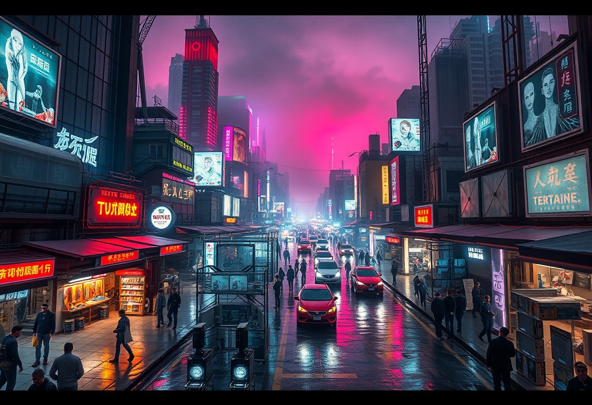 cyberpunk cityscape, futuristic skyline, neon lights, crowded streets, bustling market, robotic vendors, holographic billboards, sleek flying cars, dense fog, rain-soaked pavement, ultra-modern architecture, glass towers, glowing advertisements, gritty, reflective surfaces, towering skyscrapers, dystopian atmosphere, nighttime setting, (highly detailed:1.3), cinematic lighting, chaotic energy, sleek machinery, artificial intelligence, (bright neon colors:1.4), organic technology fusion, cybernetic organisms, tech-enhanced humans, illuminated signage, (hyper-detailed), bustling metropolis, futuristic clothing, holographic displays, high-tech gadgets, sharp contrast, dynamic perspective, sleek aesthetics, ultra-modern design, glossy surfaces, reflective streets