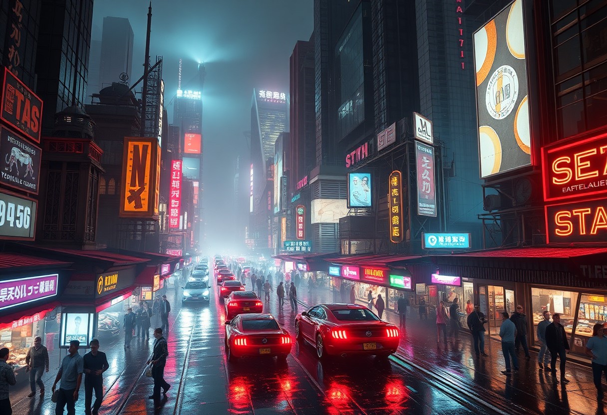cyberpunk cityscape, futuristic skyline, neon lights, crowded streets, bustling market, robotic vendors, holographic billboards, sleek flying cars, dense fog, rain-soaked pavement, ultra-modern architecture, glass towers, glowing advertisements, gritty, reflective surfaces, towering skyscrapers, dystopian atmosphere, nighttime setting, (highly detailed:1.3), cinematic lighting, chaotic energy, sleek machinery, artificial intelligence, (bright neon colors:1.4), organic technology fusion, cybernetic organisms, tech-enhanced humans, illuminated signage, (hyper-detailed), bustling metropolis, futuristic clothing, holographic displays, high-tech gadgets, sharp contrast, dynamic perspective, sleek aesthetics, ultra-modern design, glossy surfaces, reflective streets